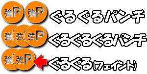 | 弱パンチボタン(弱P) | ダメージは少ないのですが、隙の少ないパンチによる攻撃です。 一般的にこの攻撃は「強パンチボタン(強P)」による攻撃より近い敵しか攻撃できません。 しかし、モーションが小さく、ボタンを押してからすぐ出たり、出た後の硬直時間が短くてすみます。 |