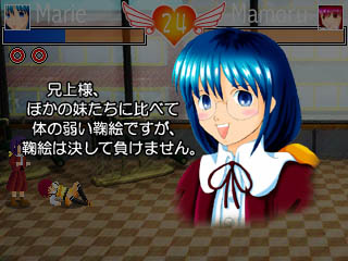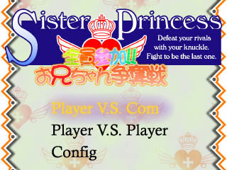 先に2勝した側、また決着がつかなかった場合コンピュータ側の勝利画面が表示されます。 この時、勝利側またはコンピュータ側のマイシスターの画像とメッセージが表示されます。 この画面は何かキーが押されるまで続きます。 また、負けた側がプレーヤーでかつ「一人でコンピュータと戦う場合」が選択されていた場合、ゲームを続けるかどうか確認するための画面が表示されます。 タイマーが0になる前に、何かボタンが押されれば再戦できます。