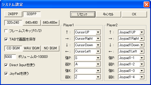 | Direct Inputを使う | 入力方法を選びます。 キーボードとJOYPADの入力をDirect Inputから取り込むか、WIN32から取り込むか選択します。 入力がおかしい場合は変更してください。 |
