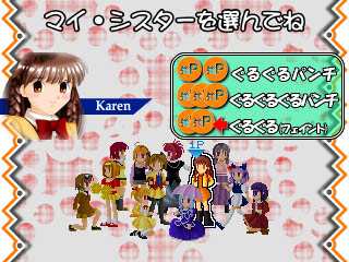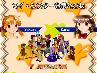一人でコンピュータと戦う場合、自分が操作する「マイシスター」を選択してください。 このモードでは選択したマイシスター以外と最後に自分が選択したマイシスターの偽者と戦うモードです。 各マイシスターの特徴は5章を参照してください。 キャンセルボタンを押すことでタイトル画面に戻ることができます。