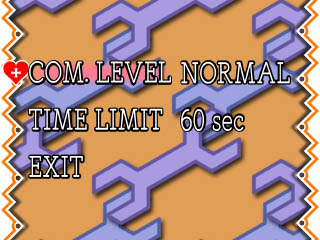 難易度と制限時間を変更することができます。 ↑↓キーで項目を選択し、決定ボタンを押すことで設定を変更することができます。 「COM. LEVEL」はコンピュータと対戦した場合の難易度を示します。SWEET、NORMAL、HOTの順に難しくなります。 「TIME LIMIT」は制限時間を示します。60secとUNLIMITEDから選択できます。 60secは60秒戦うと自動的に戦闘が終了します。 UNLIMITEDはどちらかが倒れるまでのデスマッチです。 「EXIT」を選択するとタイトル画面に戻ることができます。